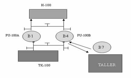 En la misma podrán notar que hay dos bombas de agua PU-100A y PU-100B que alimentan a la caldera H-100. Estos códigos representan los códigos funcionales identificados en el proceso. Muchas veces este código se indica en el piso, y también, como ya lo saben, en los diagramas de flujos de procesos y en diagramas de tuberías e instrumentación (P&ID), pero lo realmente importante es que estos son códigos de procesos. Este código de proceso para una mayor efectividad tenemos que combinarlo con un código particular. Para aclararlo, volviendo a la figura anterior, vemos que en la posición funcional PU-100A está ocupada en ese momento por la bomba de cédula particular B1, y en la posición PU-100B está siendo ocupada por la bomba B4. Ahora bien, de pronto, esta bomba B4 falla y sale al taller para su reparación, y en su lugar entra la bomba B7 a ocupar la posición.